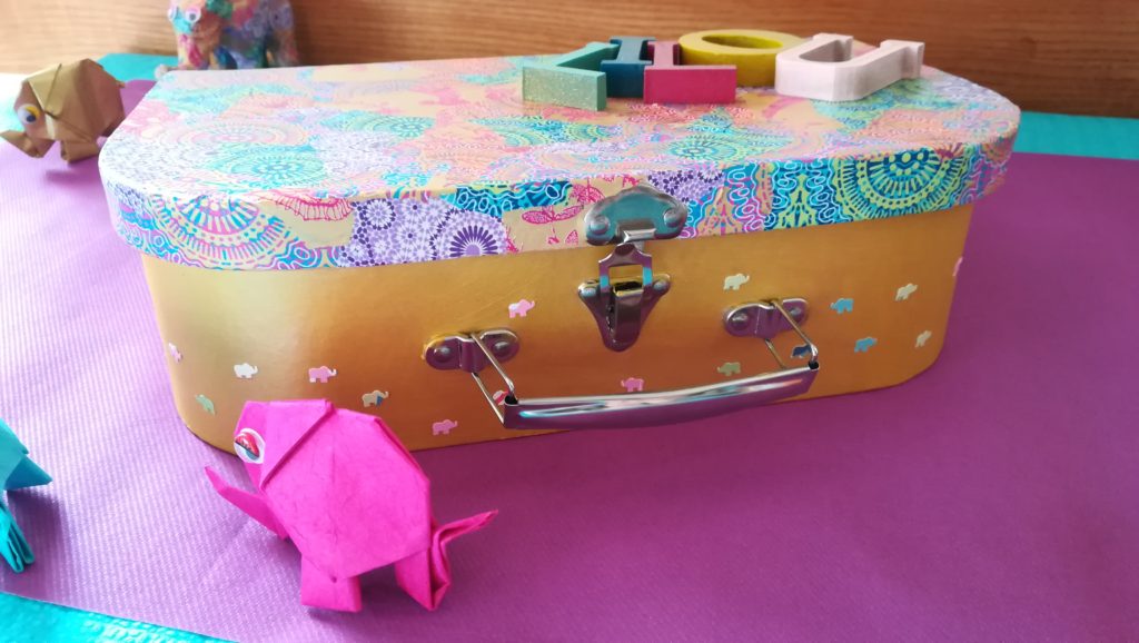 Les invités ont pu déposer dans l’urne leurs enveloppes. C’est une petite valise décorée avec du papier « décopatch » à l’allure très indienne. C’est presque « kitch » mais tellement bien assumé par Lilou 😉 Ma touche moderne : son prénom écrit en lettres de bois peintes !